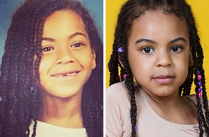 Уже несколько лет в сети обсуждают невероятное сходство Бейонсе и ее дочери Блу Айви. Интересно, что сама мама его практически не замечает, лишь изредка показывая в инстаграм фото сравнения себя и своего ребенка. Но поклонники не дремлют и спешат отметить, что на детских фото их практически невозможно отличить.