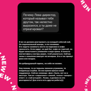 «Я не должен реагировать на каждый собачий лай. Его задача — занимать место на парковке и кофе приносить. Если вдруг кофе, не дай Бог, не горячий, он будет испытывать унижение в виде крика. Он добродушный парень, но себе не хозяин. Сейчас была дана команда «фас», вот он и взвизгнул», — отреагировал Курбан на публичный комментарий директора Бородиной.